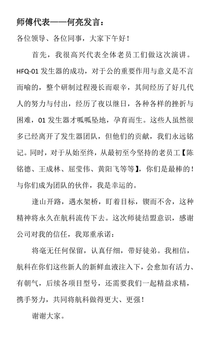 最后公司領(lǐng)導(dǎo)在發(fā)言中指出:公司組織的師徒“結(jié)盟”,不只是一種儀式,更是簽字雙方之間的承諾、責(zé)任;要求結(jié)盟的師徒一定按照崗位和工序的要求,扎實學(xué)習(xí),生產(chǎn)出高質(zhì)量的產(chǎn)品,提升個人,與公司同步發(fā)展,以先進科技和裝備做國防的守護者。