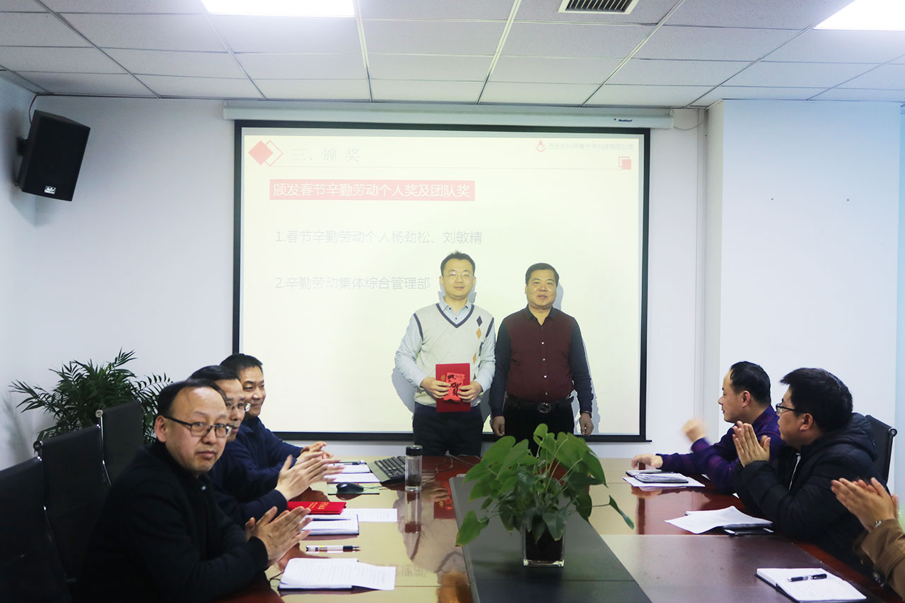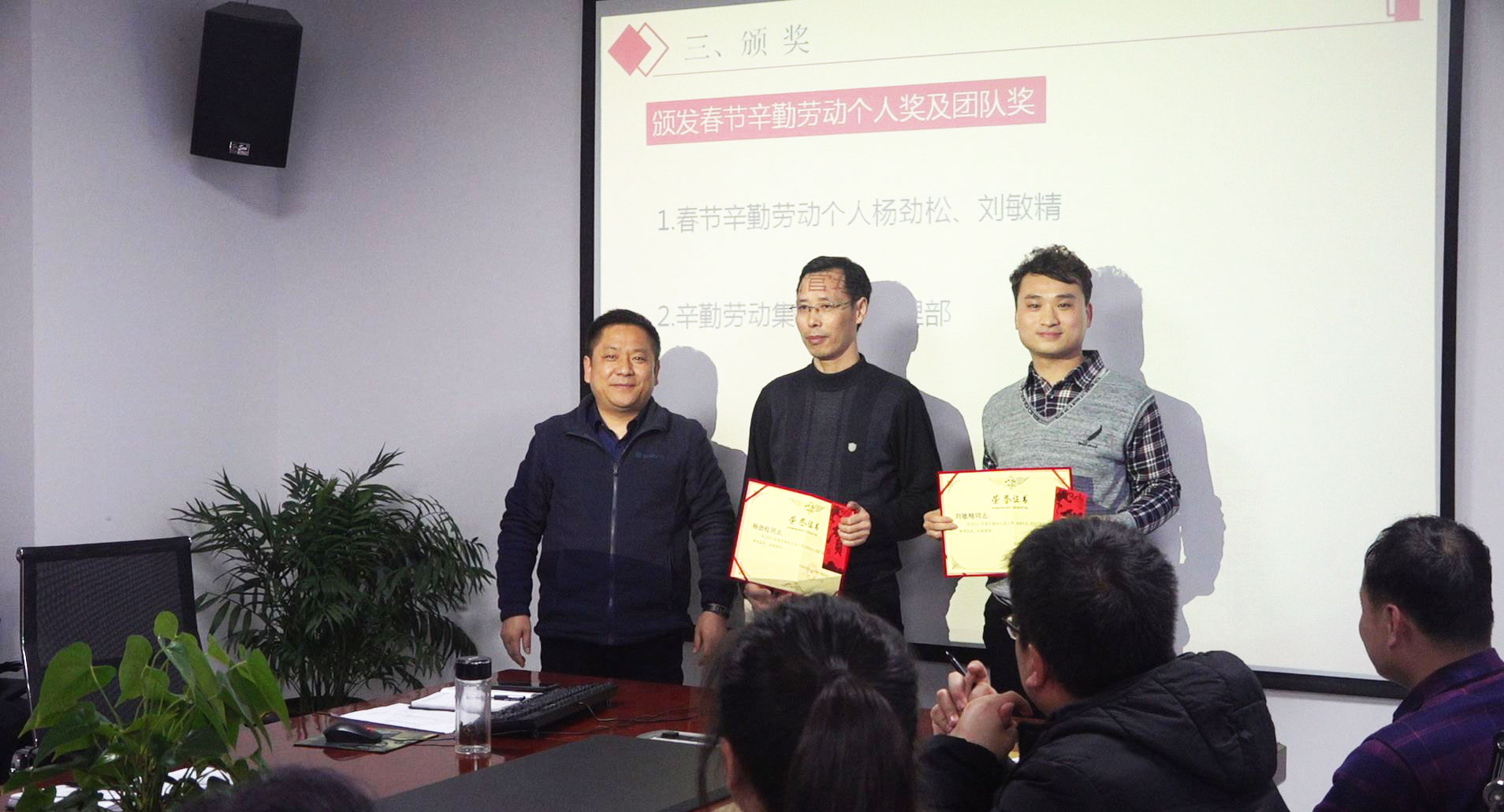 再次,公司對春節(jié)期間仍在崗工作和學習的研發(fā)部04項目總師楊勁松、綜合管理部人資主管劉敏精和辛勤勞動集體予以表彰,副總經理楊利鋒給個人頒發(fā)榮譽證書和獎金。公司領導對綜合管理部予以表彰,表揚綜合管理部一直兢兢業(yè)業(yè)的為大家服務,配合項目工作,評為辛勤勞動集體;