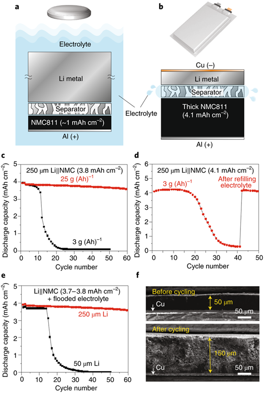 我們平時(shí)研究Li金屬電極時(shí)使用了成倍過(guò)量的鋰金屬和電解液,所得大多數(shù)研究結(jié)果中不能被放大應(yīng)用到實(shí)際的軟包電池中。對(duì)于以往研究的大多數(shù)可充放電扣式電池,其能量密度遠(yuǎn)小于50Wh/kg。如圖2所示,關(guān)鍵電池參數(shù),包括正極負(fù)載,電解液量和Li金屬量(厚度)都對(duì)電池循環(huán)性能有重要影響。除了其他非活性材料(如隔膜,集流體和包裝材料)外,還必須仔細(xì)選擇這些參數(shù),以獲得長(zhǎng)循環(huán)高能實(shí)用電池。圖2:電池參數(shù)和電池壽命與Li負(fù)極形態(tài)之間的關(guān)系。a,實(shí)驗(yàn)室扣式電池經(jīng)常使用成倍過(guò)量的Li和電解液。b,具有多層堆疊電極的高能軟包電池。c-e,具有不同電解液用量(c)的Li || NMC電池的循環(huán)性能,在原始貧電解液被消耗(d)之后補(bǔ)充電解液,電池的循環(huán)性能;不同厚度Li金屬(e)的Li || NMC電池的循環(huán)性能。紅色線代表軟包電池,黑色線代表扣式電池。f,循環(huán)后,Li金屬負(fù)極的厚度變化,開始采用的是厚度為50微米的Li。用于c-e的扣式電池在C/10倍率下循環(huán)2次進(jìn)行化成,然后在2.7-4.4V的電壓范圍內(nèi)以C/3倍率循環(huán)進(jìn)行充放電循環(huán)。