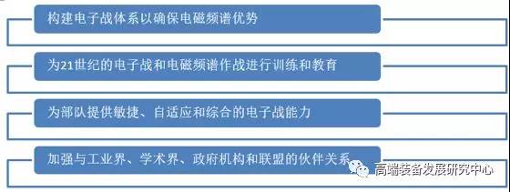 《電子戰(zhàn)戰(zhàn)略》指出,美國電子戰(zhàn)的發(fā)展愿景是通過敏捷、自適應(yīng)和綜合的電子戰(zhàn),在各種軍事行動中進攻性地奪取電磁頻譜優(yōu)勢,發(fā)展目標包括: